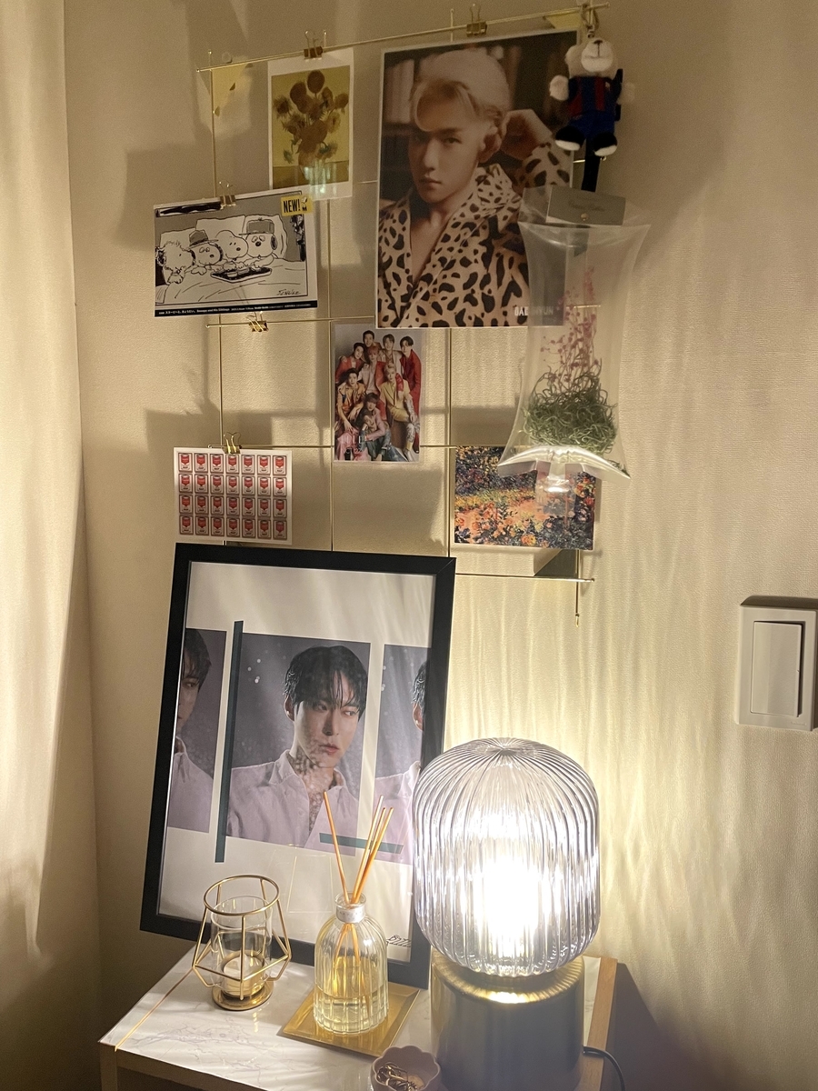 元倉庫部屋なので、一角はモノが積まれているし、ベッドもチェストもそろそろ買い替えたいなーと思っているので、全体としては100点満点とはいえないのですが、一部分でもお気に入りの場所を作りたい、ということでIKEAやニトリで小物雑貨を買って、推しを飾って、こんな感じにしました。